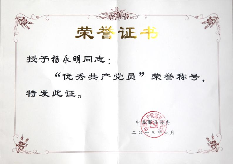 喜訊:“七一”建黨前夕,公司黨支部書記、總經理楊永明同志被中共鄖縣縣委授予“優秀共產黨員”榮譽稱號